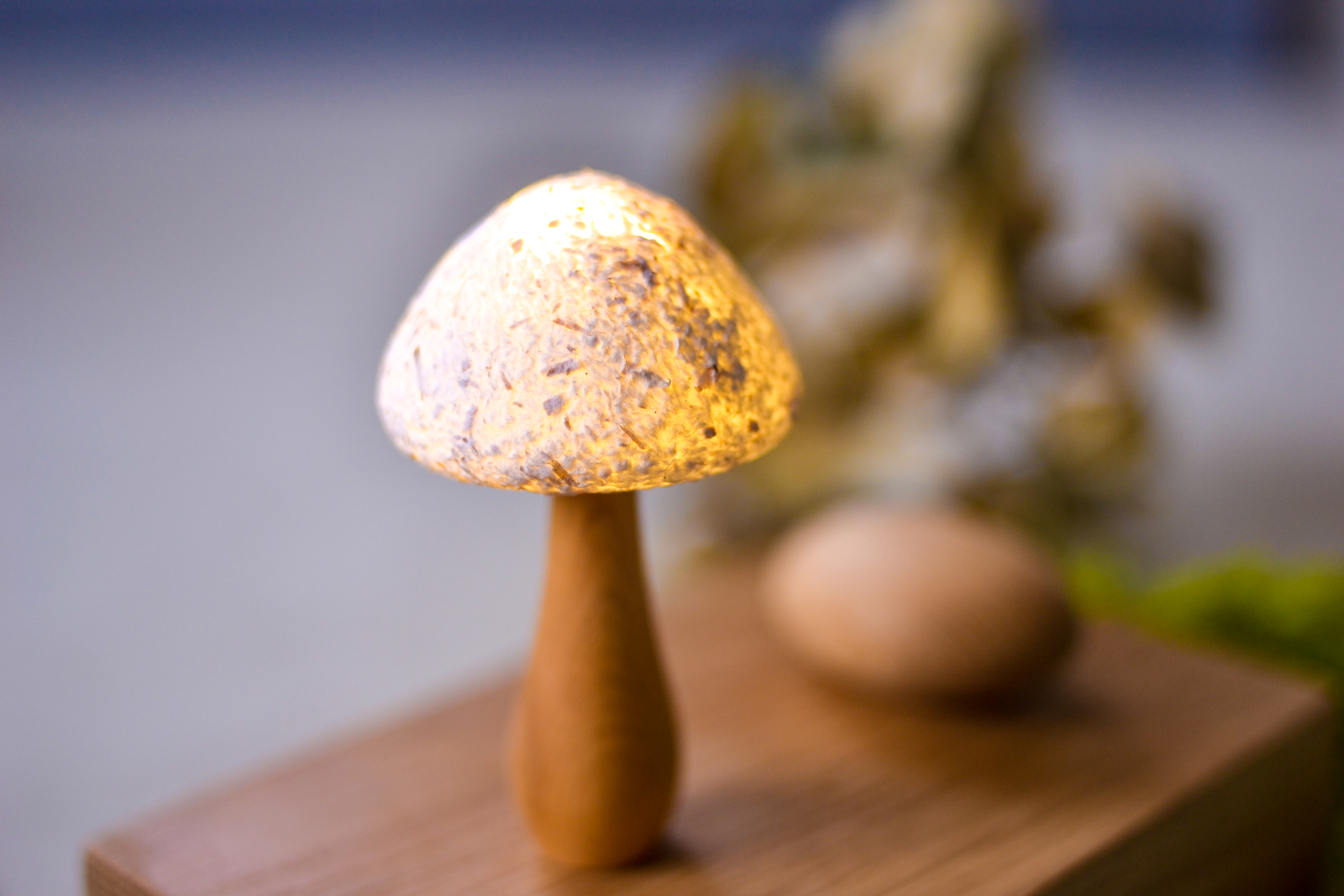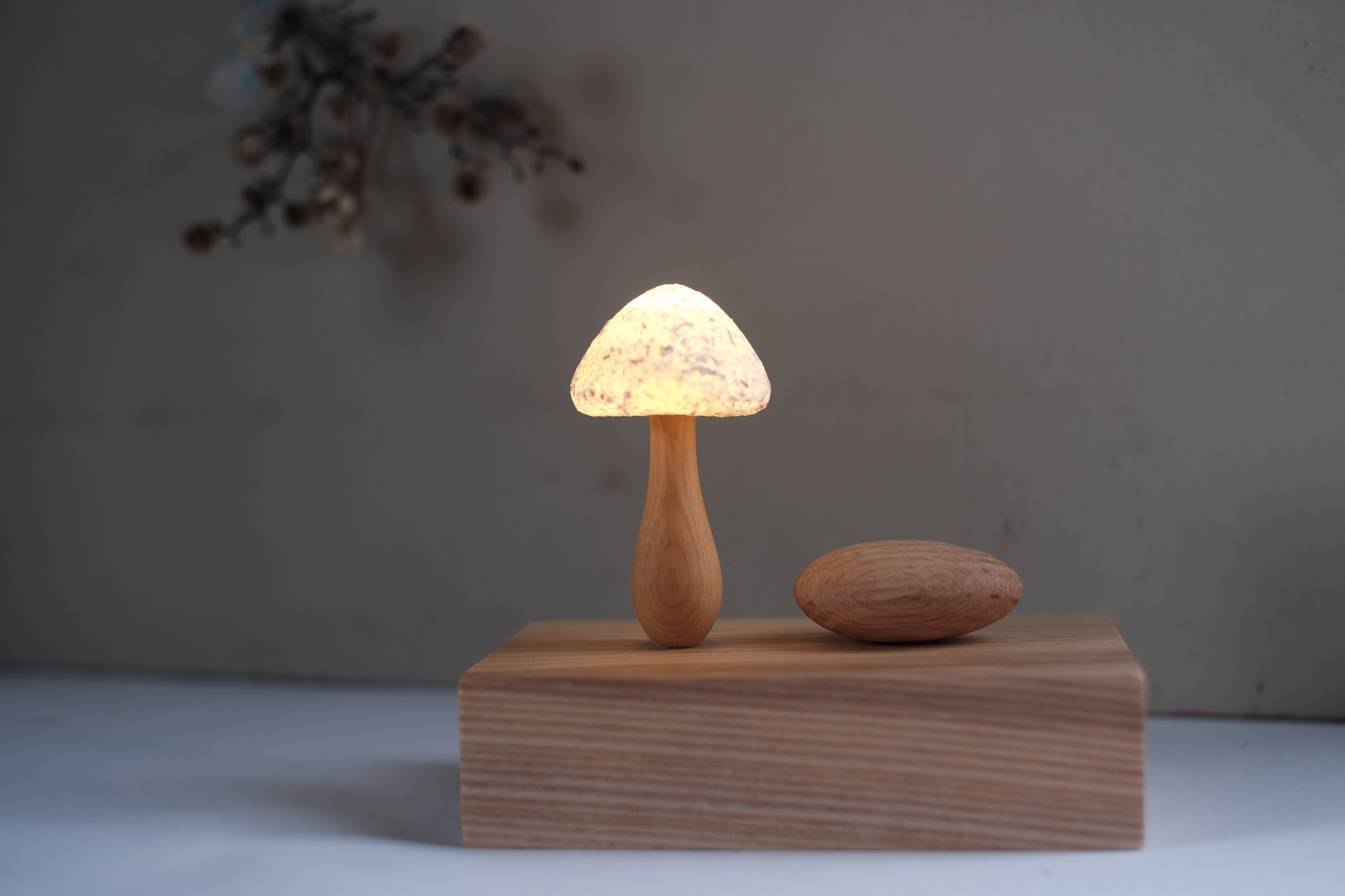 蘑菇使用紙漿和檜木木屑表現蘑菇的柔和和質地,與木頭莖部及底座結合,呈現其溫潤。