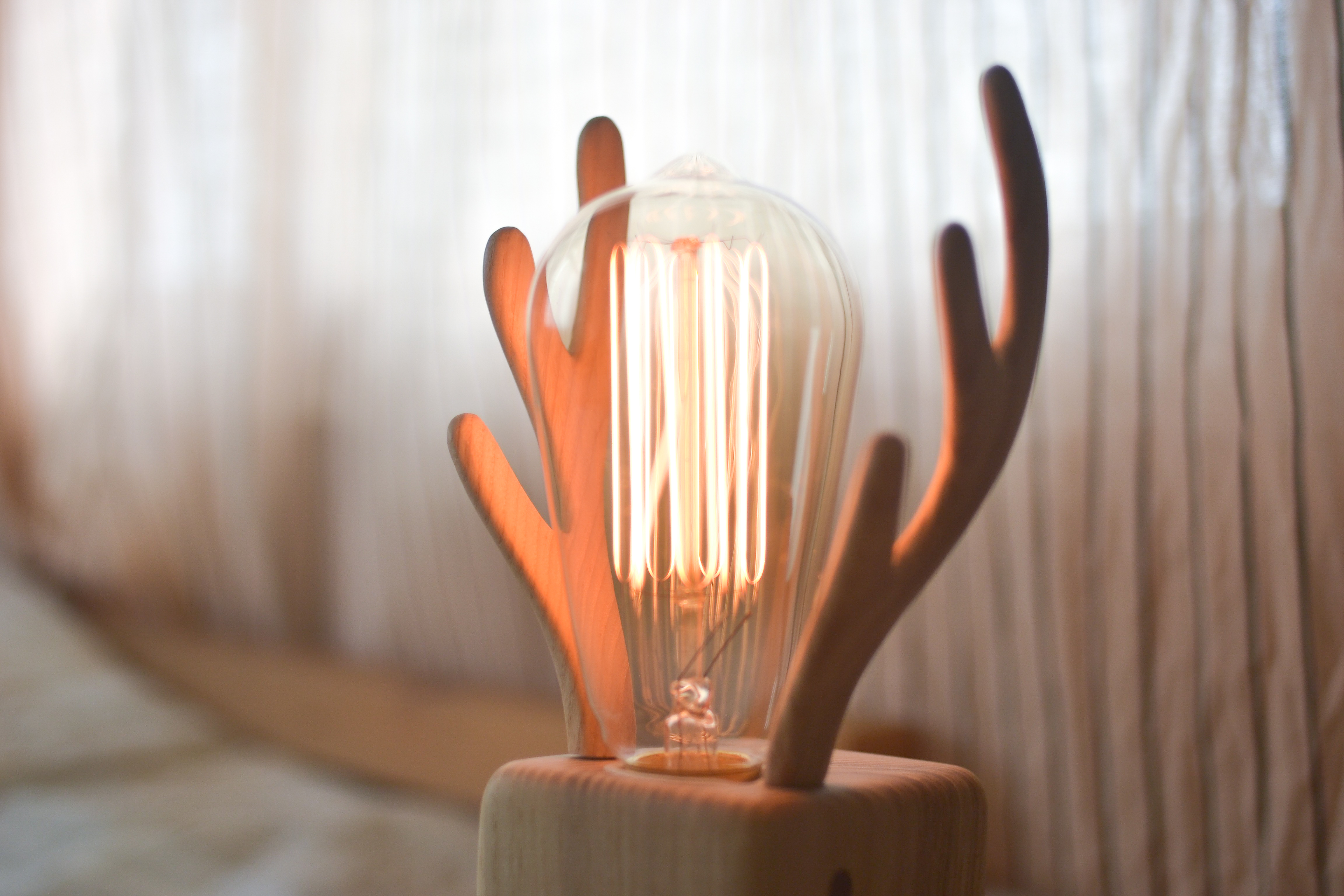 使用愛迪生鎢絲燈泡,並結合鹿角為其燈罩,讓兩者結合彼此的美感,將光線帶進空間中,同時增加生活的溫度。建議也可自行替換為合適的燈泡。