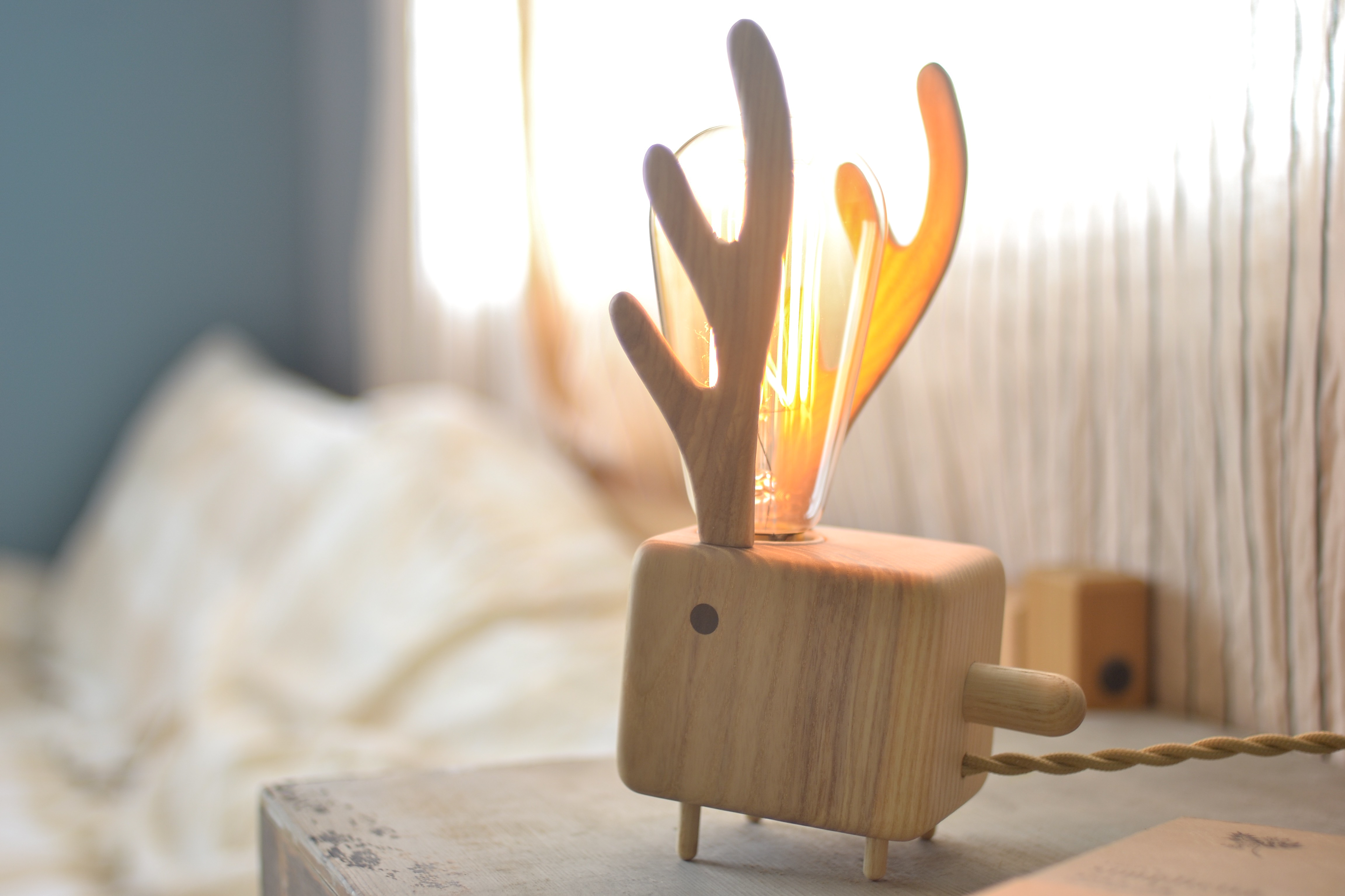 開關設計在麋鹿的尾巴上,在使用時可適性調整,設計為可調光,可依每個人使用習慣、時間的不同,來調整亮度